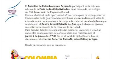 Colectivo de colombianos en Paysandú estará presente en feria de las colectividades Una vez más la alegría y gastronomía colombiana estará presente en el… junio 7, 2018147 views1 minute read