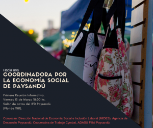 Convocan a este primer encuentro la Dirección Nacional de Economía Social e Inclusión Laboral del MIDES, la Agencia de Desarrollo Paysandú, la Asociación de Asistentes Sociales del Uruguay Filial Paysandú y la Cooperativa de Trabajo Cymbal.